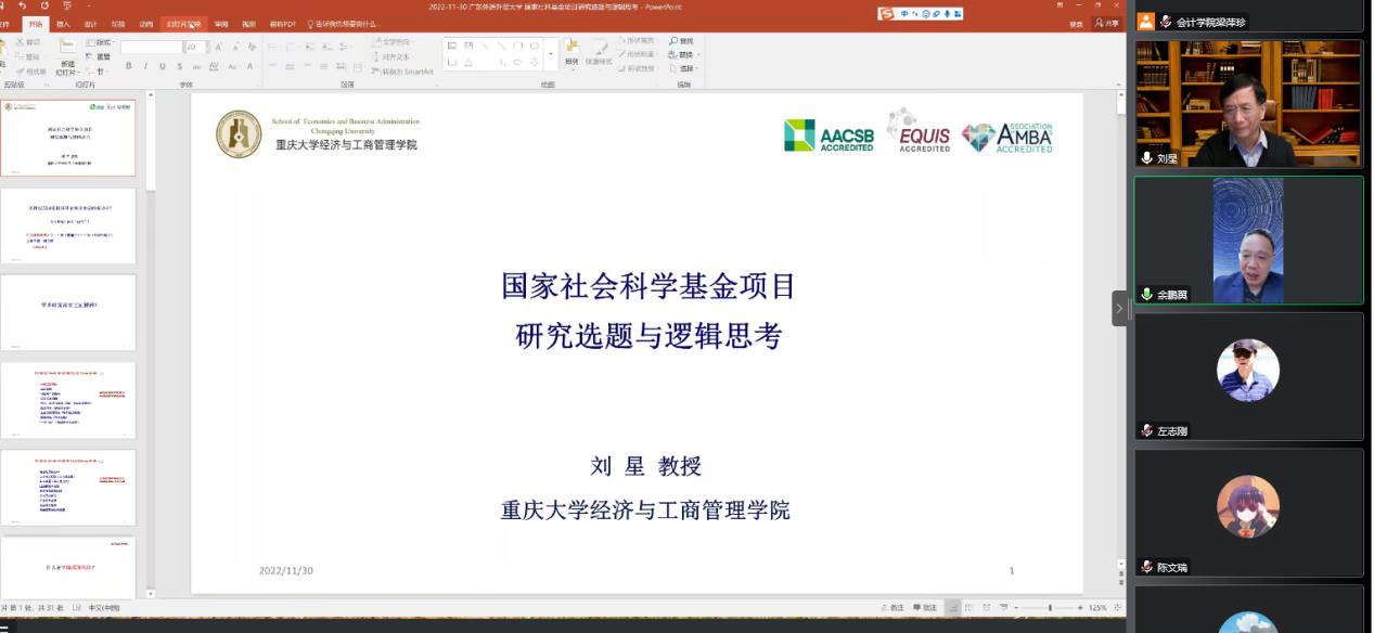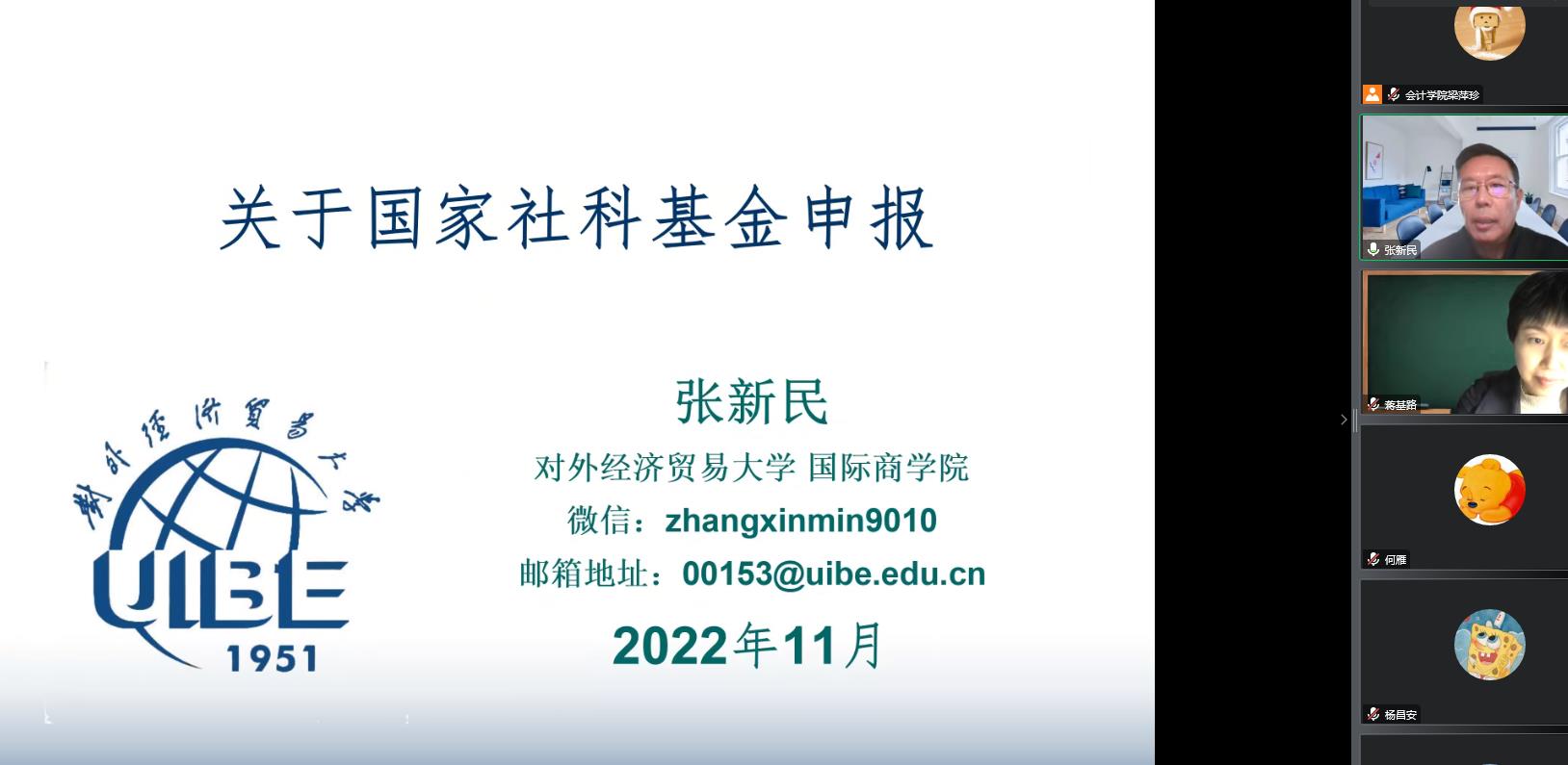 11月30日-12月1日,tyc7111cc太阳成集团通过在线形式举办“tyc7111cc太阳成集团商学院2023年度国家基金申报系列讲座之基金申报专家报告会”。会议邀请了重庆大学刘星教授和对外经贸大学张新民教授到会开展项目申报指导,我们有意向申报2023年度国家级项目的20余位教师参会。会议分别由tyc7111cc太阳成集团余鹏翼院长、蒋基路副院长主持。